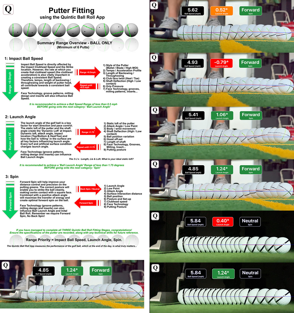 The Quintic Ball Roll App objectively measures; ball speed, launch angle and spin allowing you to make informed decisions on putter design, putter fitting and putter mechanics.