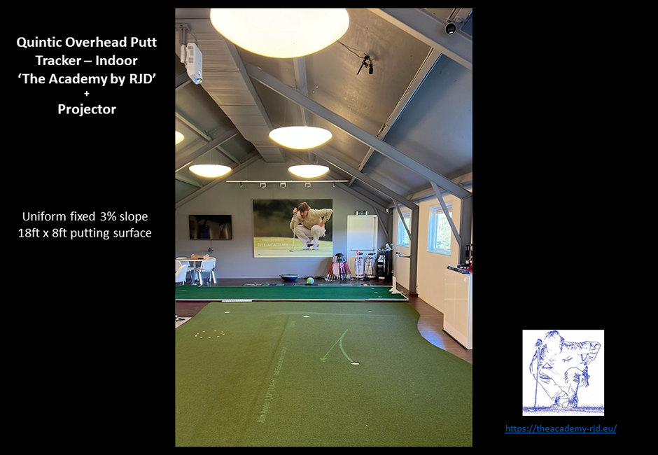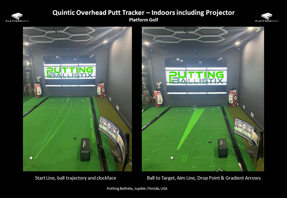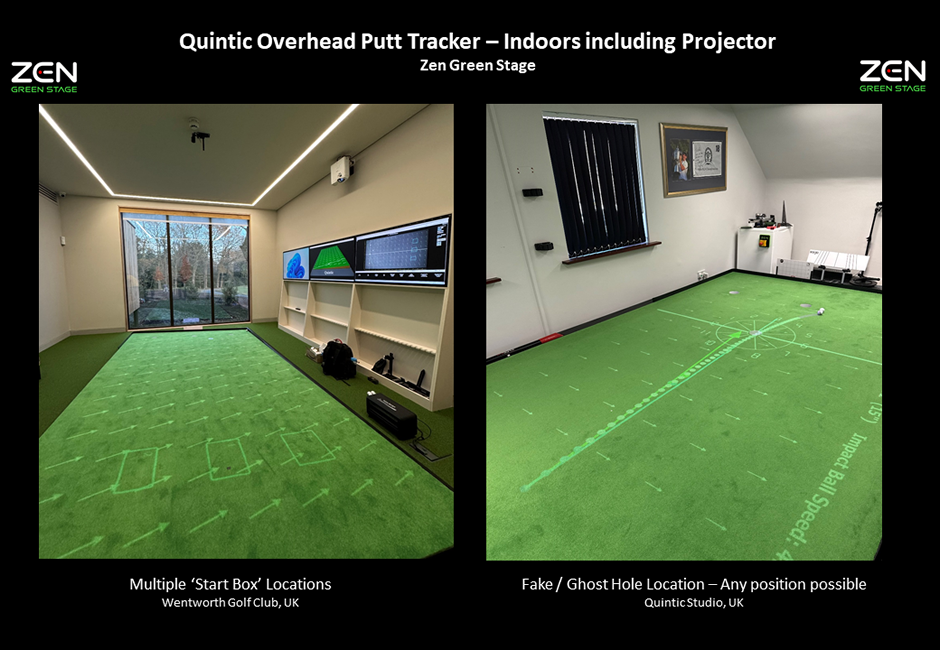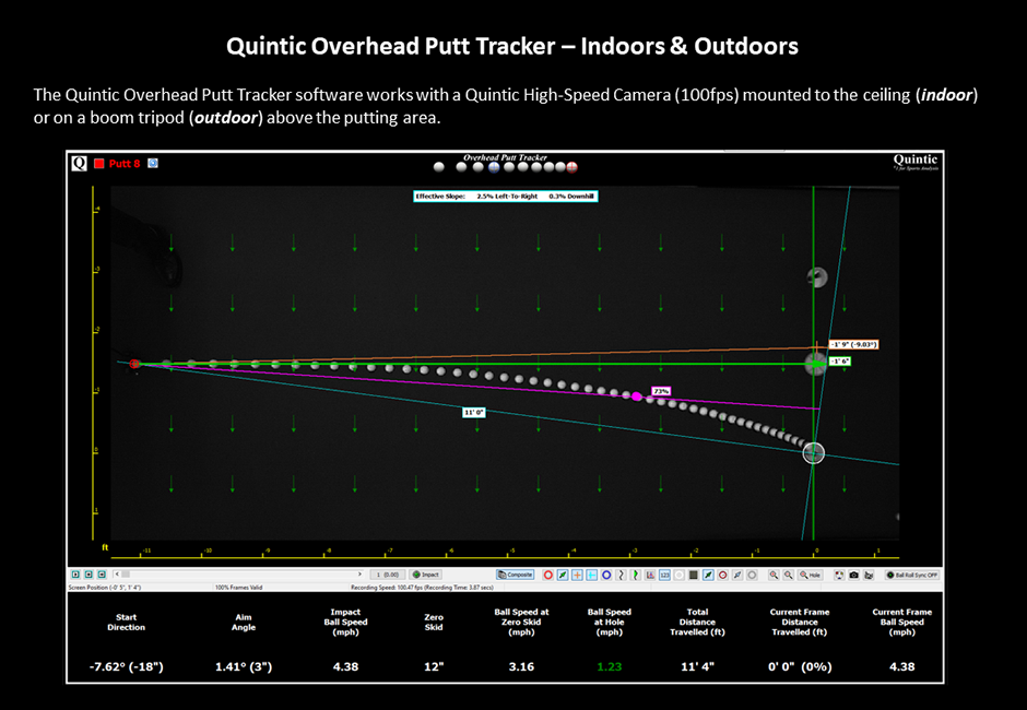 The Quintic Overhead Putt Tracker is our latest development in our Quintic Ball Roll technology range. The Quintic Overhead Putt Tracker software works with a Quintic High-Speed Camera mounted to the ceiling (indoor) or on a boom tripod (outdoor) above the putting area.
