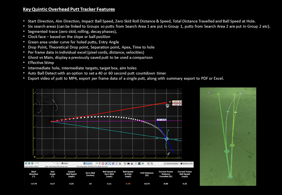 It is possible to synchronise the Overhead Putt Tracker with Quintic Ball Roll. With one click of a button both systems will capture the same putt, which can be loaded into the corresponding summary ready for analysis. The technology has been designed for everyone, from coaches to club manufacturers to R&D engineers and club fitters.