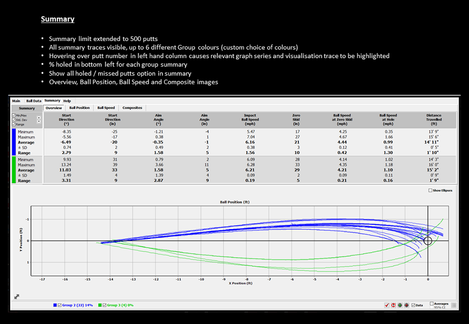 The software allows for multiple comparisons of shot patterns, dispersion and consistency. It will test the player’s intended aim against the actual start direction of the golf ball, either on a flat surface or slope! Visual cues used by a player at set-up, along with their posture, have a significant influence on aim and start direction. Ball speed determines line, therefore different ball speeds will result in different ball paths. These can be layered on top of each other in the summary tab in the software. Once the ideal ball path is recorded, this can be superimposed on the LIVE video providing immediate feedback on both direction and ball speed.